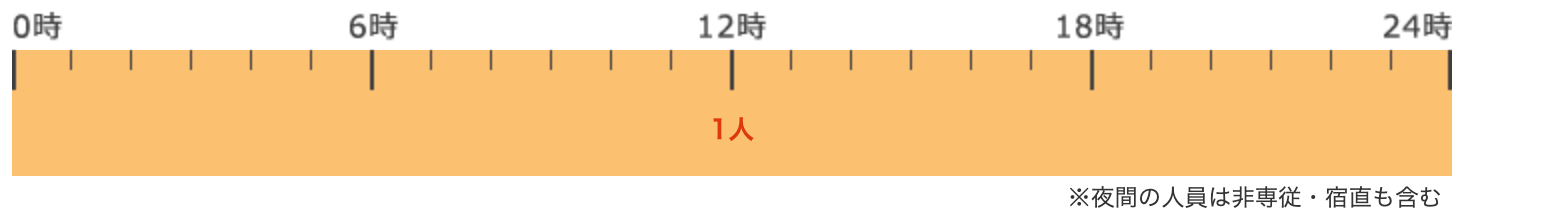 | 夜間の人員配置(内訳) | 夜勤職員(専従)が常駐,夜勤職員(非専従)が常駐 | ||||||||||||||||